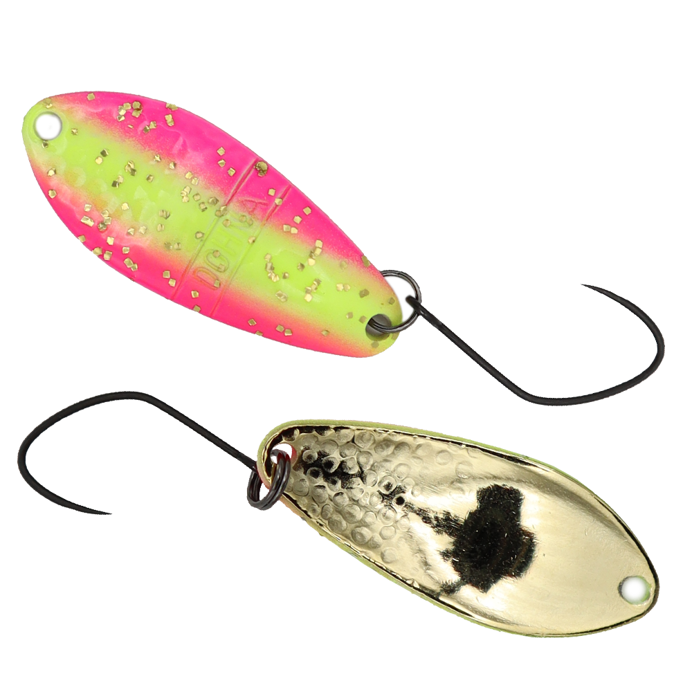 Ob Fließ- oder Stillgewässer, durch seine verschiedenen Gewichtsklassen von 0,8g – 3,0g und die hohe Farbauswahl ist er jeder Situation gewachsen. Ein weiterer Vorteil ist seine asymmetrische Form. Das Spoonblatt des Antem Dohna ist vorne breiter als hinten. Durch diese Form wird der Wasserwiderstand erhöht, was den Köder lebhafter spielen lässt. Die spezielle Spoonoberfläche erzeugt Blinkreize, die den Fisch zum Anbiss verleiten.