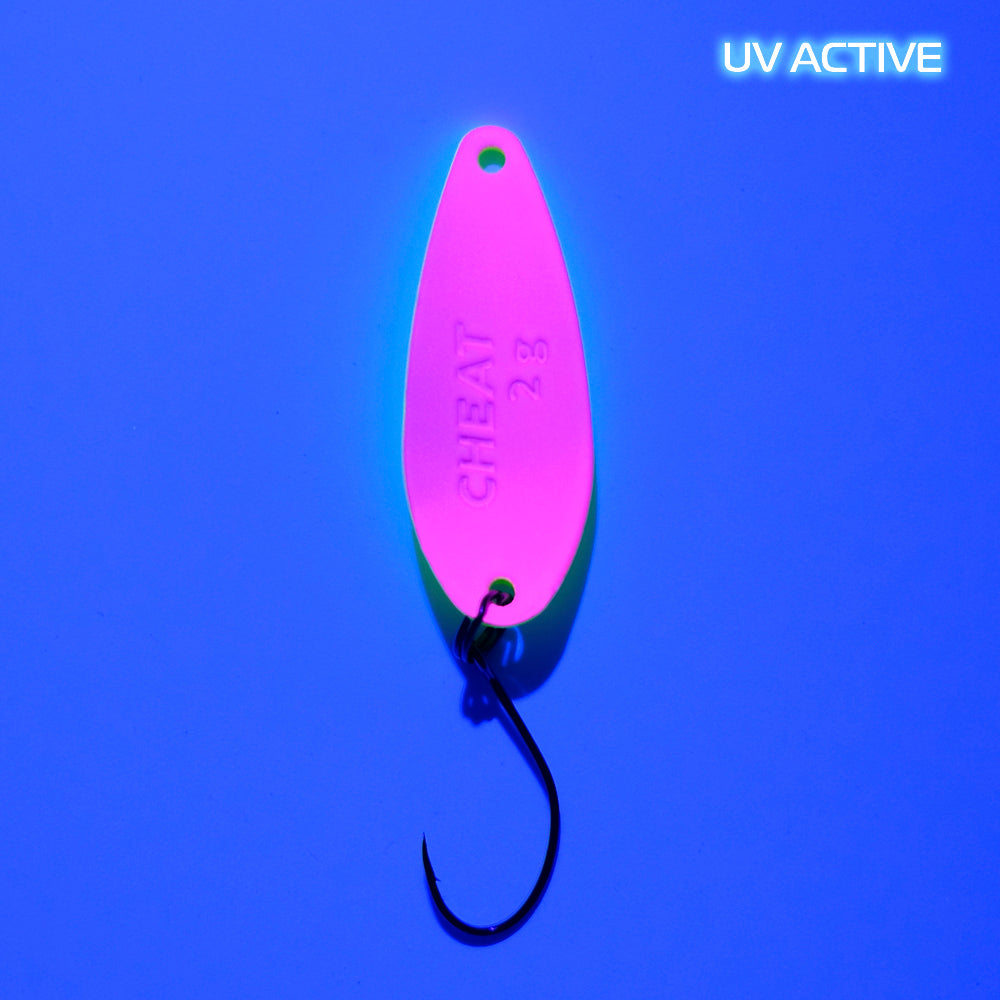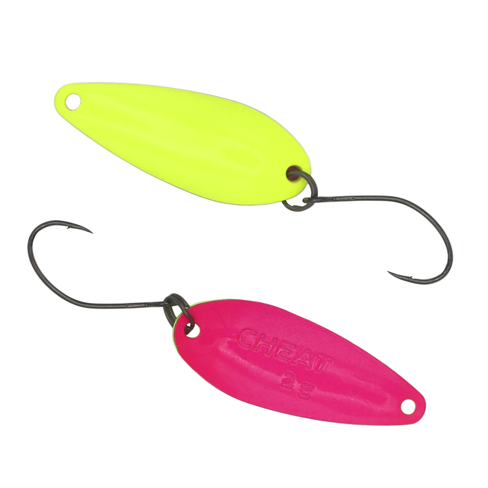 CHEAT 2 g ist ein brandneuer Spoon von FANGENSWERT. Wie der Name dieses äußerst interessanten Spoons schon verrät, wird CHEAT am Wasser sehr oft zu einem universellen Schlüssel, der praktisch alle Türen der Forellenwelt öffnen kann. Denn dieser Spoon kann wirklich alles. Mit seinem Gewicht von 2 g und seiner durchdachten Form lässt sich CHEAT richtig weit auswerfen und kann bei Bedarf in nahezu allen Wassertiefen geführt werden, auch wenn er in erster Linie fürs Mittelwasser konzipiert ist. Als ein ziemlich breitflächiger Spoon entfaltet CHEAT sein schönes Spiel direkt mit der ersten Kurbelumdrehung.