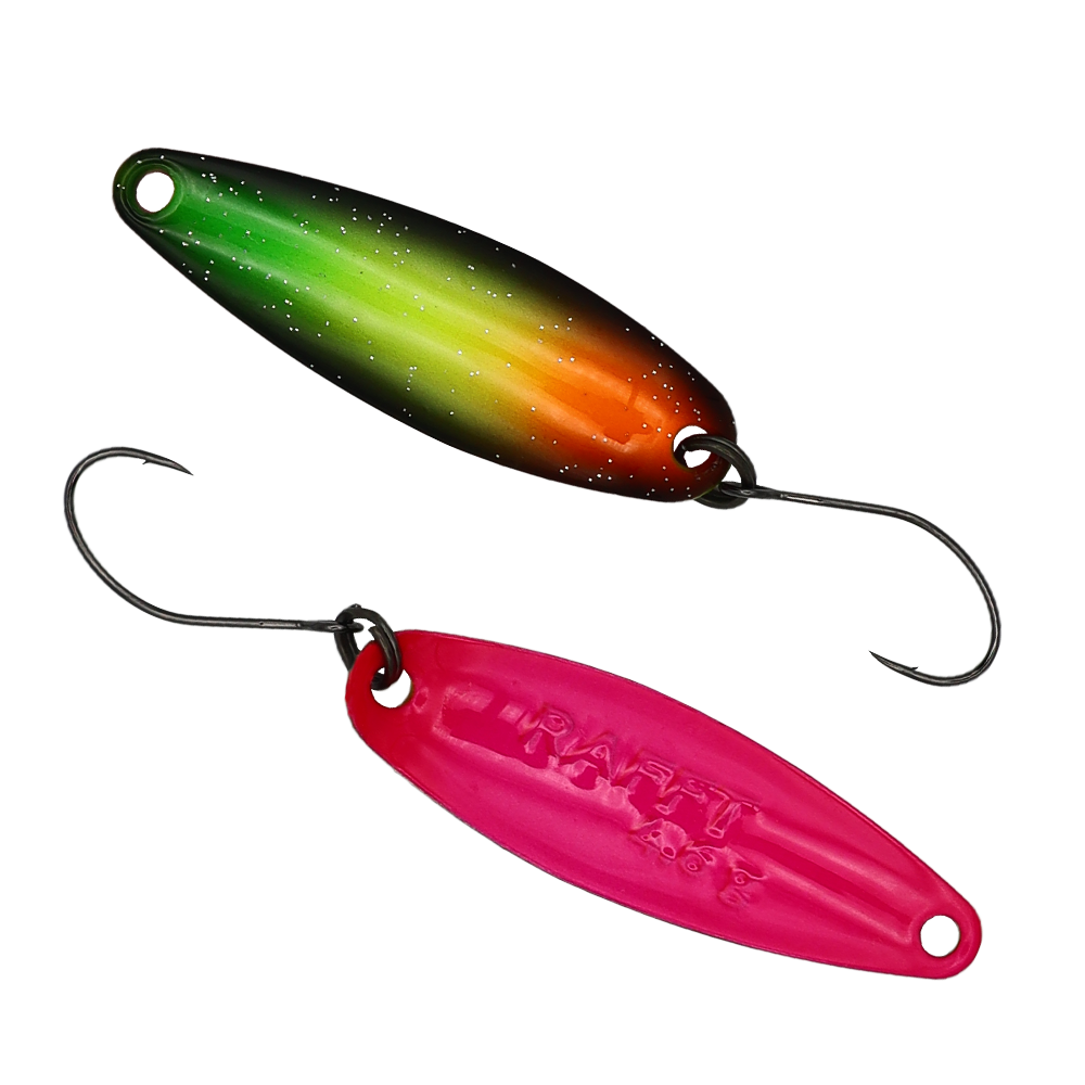 RAFFT 4.6 g ist ein brandneuer Spoon von FANGENSWERT, RAFFT ist der schwerste Spoon in der Serie und somit für weite Würfe und Angeln im Mittelwasser sowie grundnah konzipiert. Durch seinen frequenten Lauf lockt RAFFT die Forellen an und provoziert sie zum Biss. Sehr oft kommen die Attacken auch beim Absinken, denn in dieser Phase hat RAFFT 4.6 g ebenso ein schönes einzigartiges Spiel, das selbst die vorsichtigsten Salmoniden nicht kalt lässt.