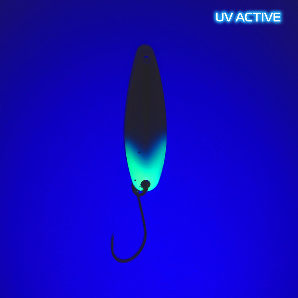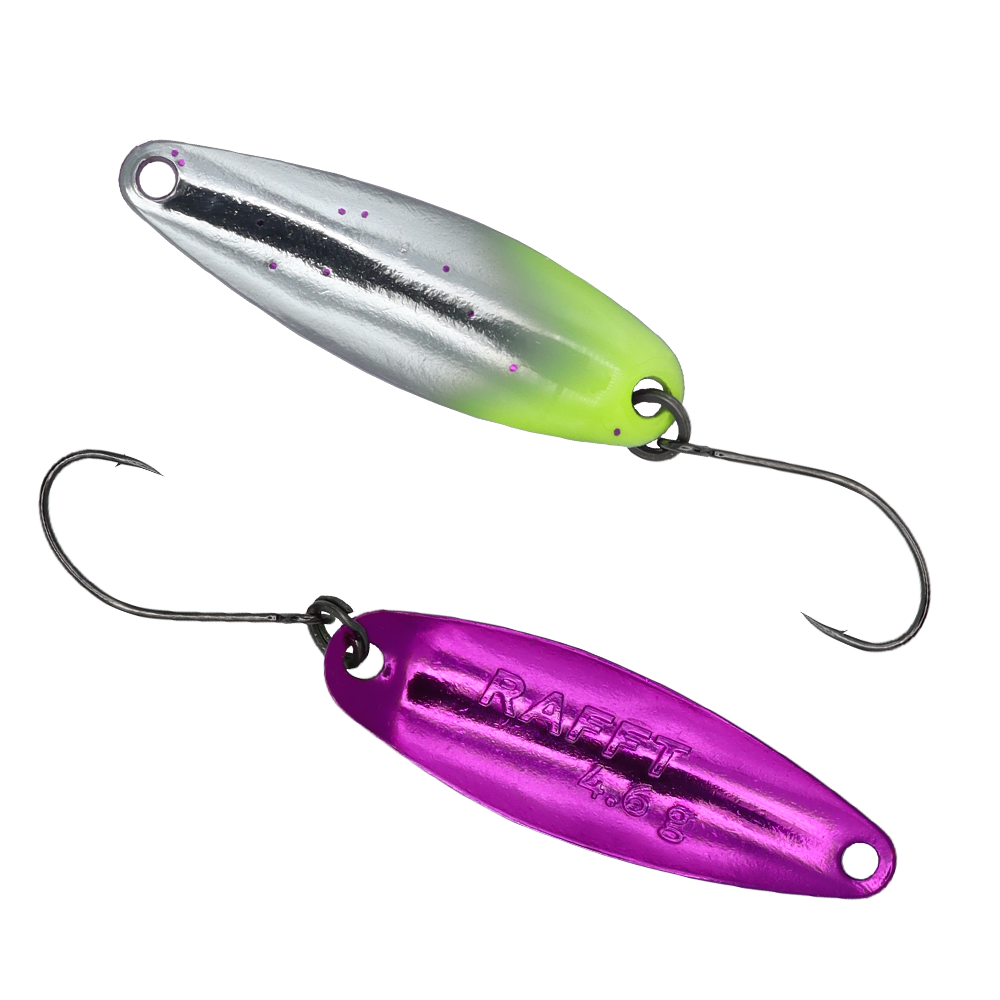 RAFFT 4.6 g ist ein brandneuer Spoon von FANGENSWERT, RAFFT ist der schwerste Spoon in der Serie und somit für weite Würfe und Angeln im Mittelwasser sowie grundnah konzipiert. Durch seinen frequenten Lauf lockt RAFFT die Forellen an und provoziert sie zum Biss. Sehr oft kommen die Attacken auch beim Absinken, denn in dieser Phase hat RAFFT 4.6 g ebenso ein schönes einzigartiges Spiel, das selbst die vorsichtigsten Salmoniden nicht kalt lässt.