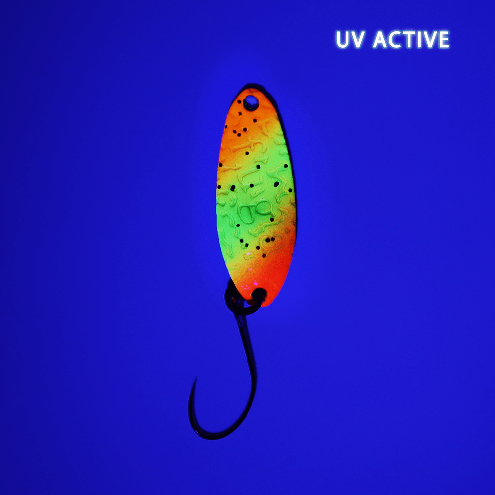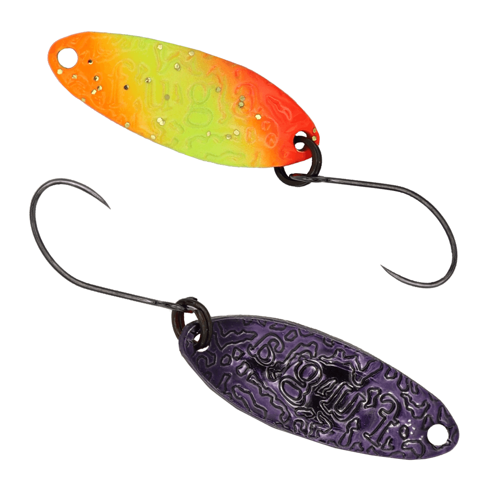Fuga von GOD HANDS ist ein Spoon, der extra fürs Forellenangeln entwickelt wurde. Das Besondere an diesem Modell sind originelle Gravuren auf beiden Seiten, die bei der Köderführung zusätzliche starke Druckwellen erzeugen und somit passive Fische provozieren. Durch die längliche Form des Spoons werden gute aerodynamische Charakteristiken und daraus folgende bemerkenswerte Wurfweiten erreicht. Den Fuga gibt es bei uns im Shop in 2.2. g – und in vielen exklusiven EM-Farben, die durch ihre UV-Glow-Elemente geprägt sind und dadurch für große Erfolge sorgen.