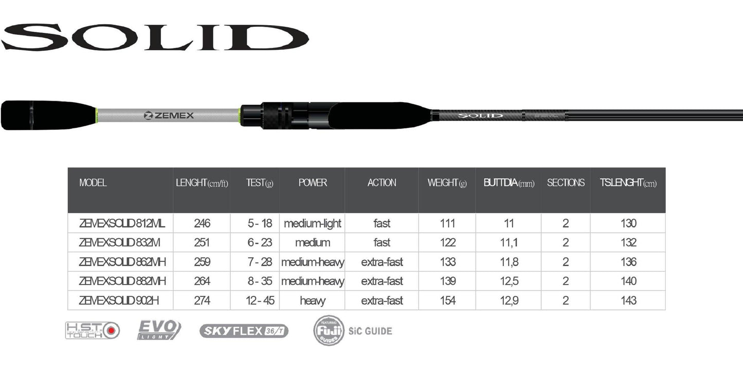 Die aktualisierte ZEMEX Solid ist eine Reihe von Sportruten. Das ZEMEX Solid-Konzept basiert auf einer Kombination aus hoher Reichweite und Resonanzeigenschaften des Blanks, was die Spinnruten der Serie zu einem hervorragenden Werkzeug macht, insbesondere für das Küstenfischen.