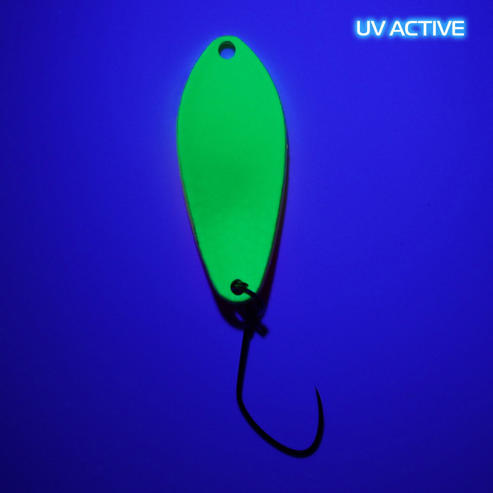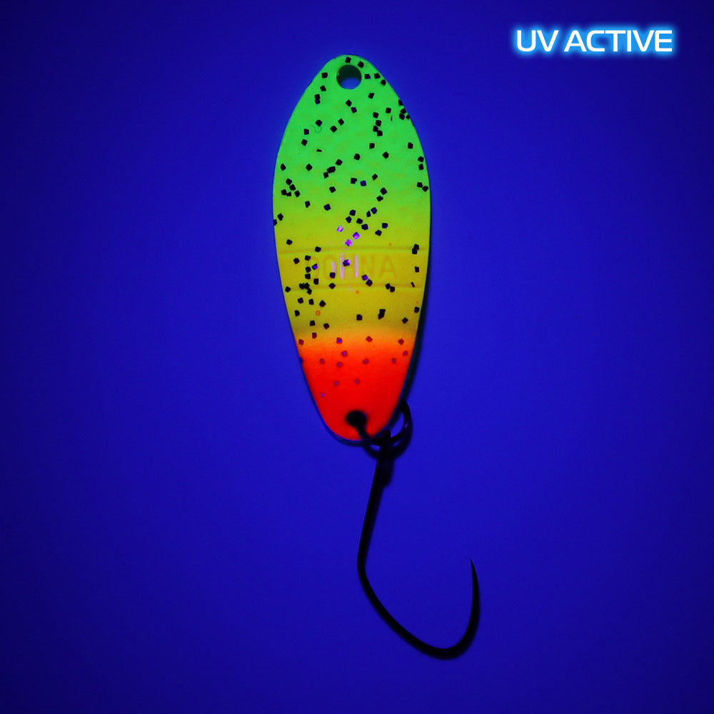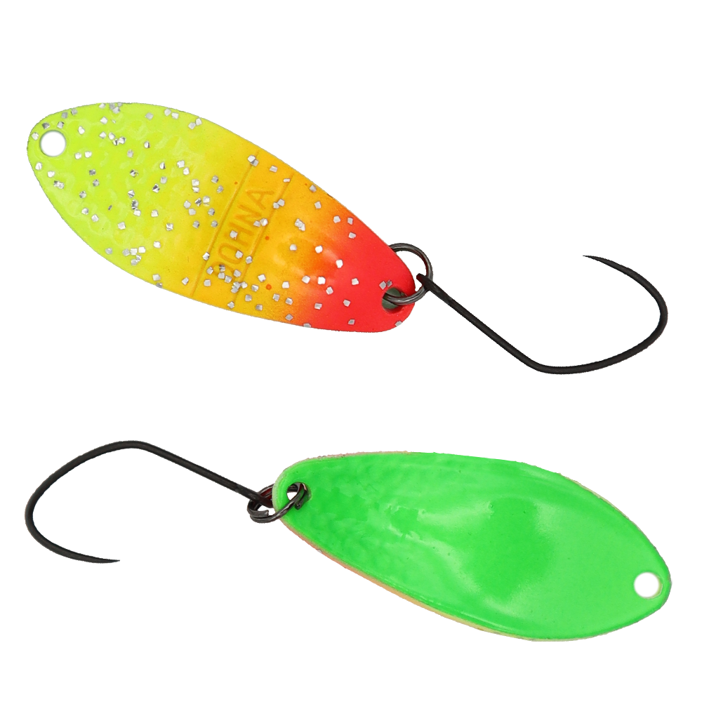 Ob Fließ- oder Stillgewässer, durch seine verschiedenen Gewichtsklassen von 0,8g – 3,0g und die hohe Farbauswahl ist er jeder Situation gewachsen. Ein weiterer Vorteil ist seine asymmetrische Form. Das Spoonblatt des Antem Dohna ist vorne breiter als hinten. Durch diese Form wird der Wasserwiderstand erhöht, was den Köder lebhafter spielen lässt. Die spezielle Spoonoberfläche erzeugt Blinkreize, die den Fisch zum Anbiss verleiten.