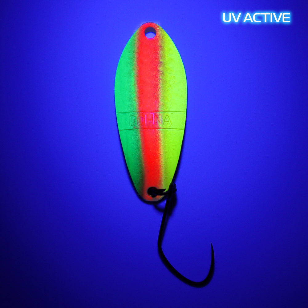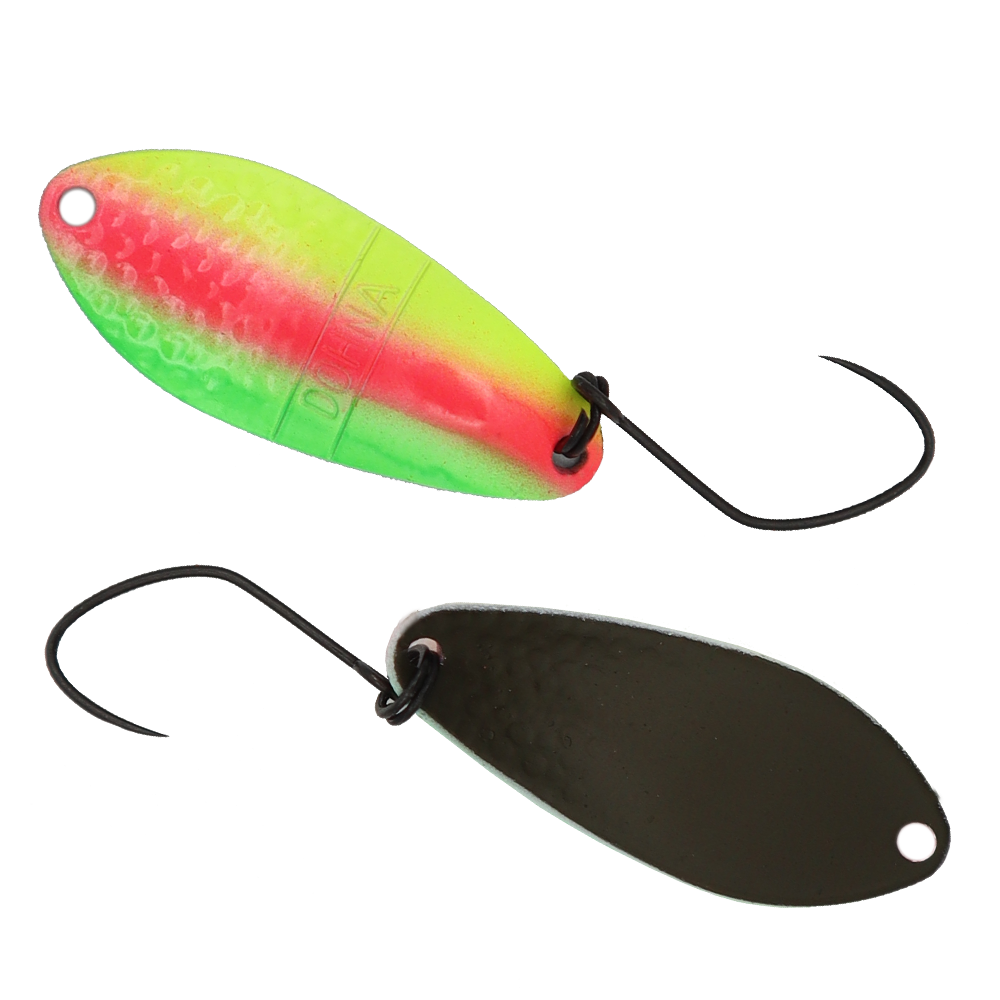 Ob Fließ- oder Stillgewässer, durch seine verschiedenen Gewichtsklassen von 0,8g – 3,0g und die hohe Farbauswahl ist er jeder Situation gewachsen. Ein weiterer Vorteil ist seine asymmetrische Form. Das Spoonblatt des Antem Dohna ist vorne breiter als hinten. Durch diese Form wird der Wasserwiderstand erhöht, was den Köder lebhafter spielen lässt. Die spezielle Spoonoberfläche erzeugt Blinkreize, die den Fisch zum Anbiss verleiten.