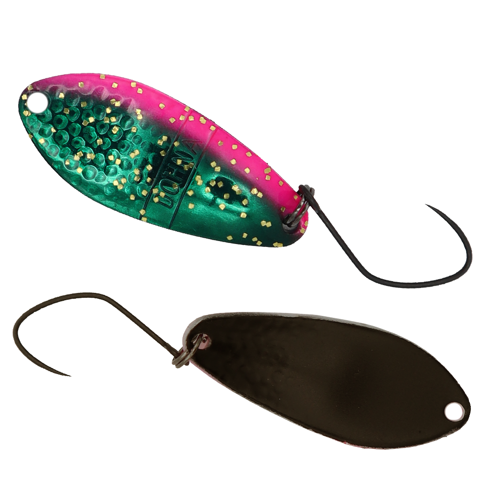 Ob Fließ- oder Stillgewässer, durch seine verschiedenen Gewichtsklassen von 0,8g – 3,0g und die hohe Farbauswahl ist er jeder Situation gewachsen. Ein weiterer Vorteil ist seine asymmetrische Form. Das Spoonblatt des Antem Dohna ist vorne breiter als hinten. Durch diese Form wird der Wasserwiderstand erhöht, was den Köder lebhafter spielen lässt. Die spezielle Spoonoberfläche erzeugt Blinkreize, die den Fisch zum Anbiss verleiten.