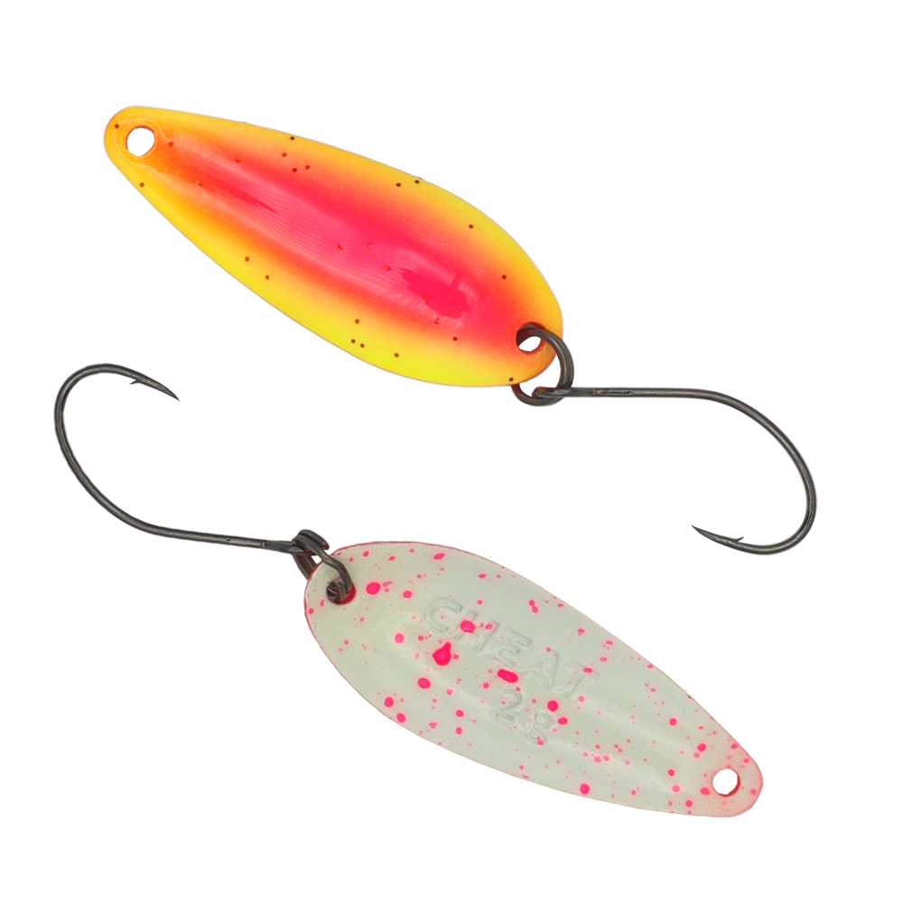 CHEAT 2 g ist ein brandneuer Spoon von FANGENSWERT. Wie der Name dieses äußerst interessanten Spoons schon verrät, wird CHEAT am Wasser sehr oft zu einem universellen Schlüssel, der praktisch alle Türen der Forellenwelt öffnen kann. Denn dieser Spoon kann wirklich alles. Mit seinem Gewicht von 2 g und seiner durchdachten Form lässt sich CHEAT richtig weit auswerfen und kann bei Bedarf in nahezu allen Wassertiefen geführt werden, auch wenn er in erster Linie fürs Mittelwasser konzipiert ist. Als ein ziemlich breitflächiger Spoon entfaltet CHEAT sein schönes Spiel direkt mit der ersten Kurbelumdrehung.