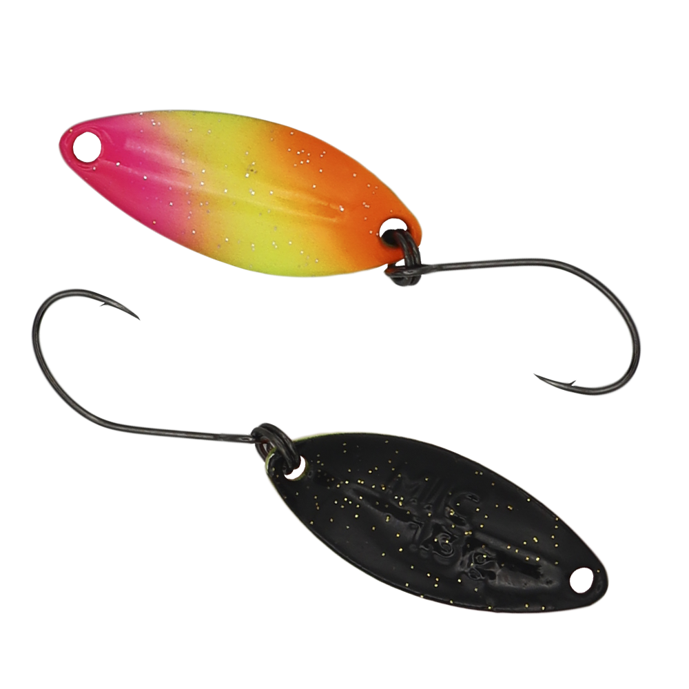 Antem MIC 1.3 g ist ein brandneuer Spoon von FANGENSWERT MIC ist der leichteste Spoon in der Serie und in erster Linie für extrem passive Forellen unter schwierigen Bedingungen, wie z.B. Mittagszeit, Hochsommer, stark beangelte Gewässer etc., konzipiert. MIC kann trotz seines relativ geringen Gewichts ziemlich weit ausgeworfen werden, was seiner aerodynamischen Form zu verdanken ist. Diese Form sorgt auch dafür, dass der Spoon selbst bei kleinsten Kurbelumdrehungen sein schönes Spiel entfaltet, sehr frequent läuft und die zickigen Fische provoziert.