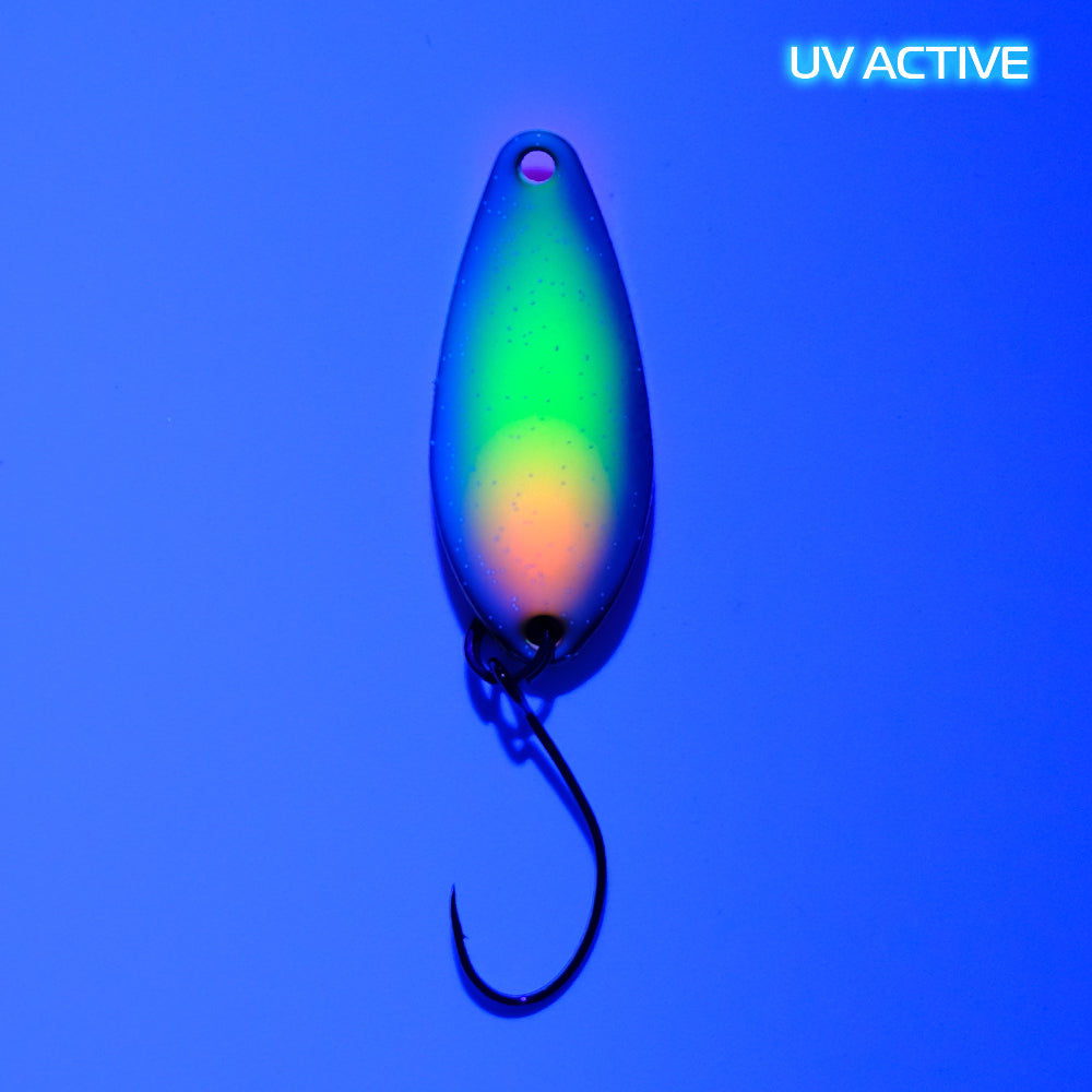 CHEAT 2 g ist ein brandneuer Spoon von FANGENSWERT. Wie der Name dieses äußerst interessanten Spoons schon verrät, wird CHEAT am Wasser sehr oft zu einem universellen Schlüssel, der praktisch alle Türen der Forellenwelt öffnen kann. Denn dieser Spoon kann wirklich alles. Mit seinem Gewicht von 2 g und seiner durchdachten Form lässt sich CHEAT richtig weit auswerfen und kann bei Bedarf in nahezu allen Wassertiefen geführt werden, auch wenn er in erster Linie fürs Mittelwasser konzipiert ist. Als ein ziemlich breitflächiger Spoon entfaltet CHEAT sein schönes Spiel direkt mit der ersten Kurbelumdrehung.